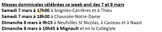 Dimanche 1er mars : 9 h Neufvilles-Gages, 9h15 Louvignies, Thieusies, Horrues et 10h45 Soignies-collégiale et Mignault.