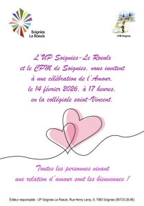 Nous vous invitons à vivre la célébration de l’Amour prévue le samedi 14 février 2026 à 17h00 en la Collégiale St-Vincent de Soignies.