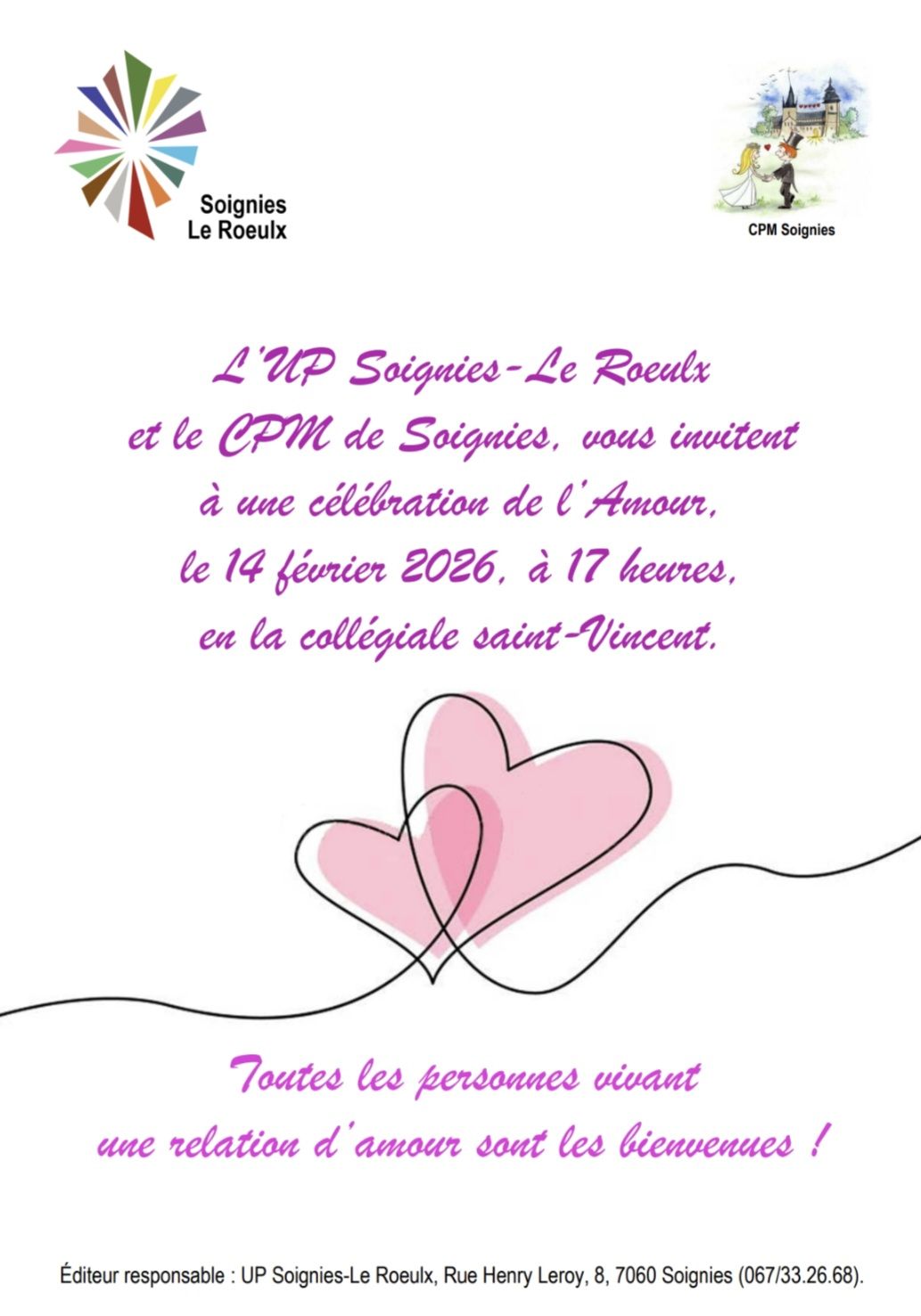 Nous vous invitons à vivre la célébration de l’Amour prévue le samedi 14 février 2026 à 17h00 en la Collégiale St-Vincent de Soignies.